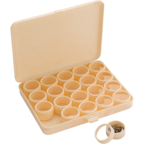 - A set of 20 mini plastic storage tubs in a rectangular storage box