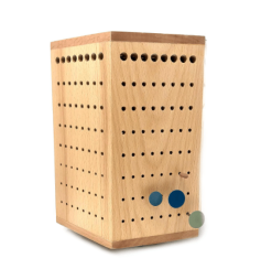 - A revolving wooden burr stand for holding burrs, drills and small tools of multiple shank diameters