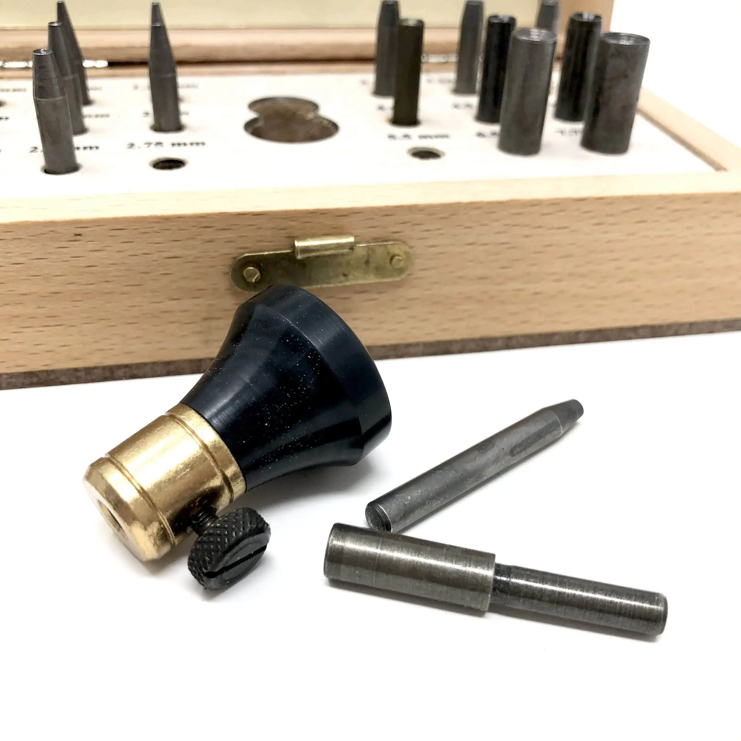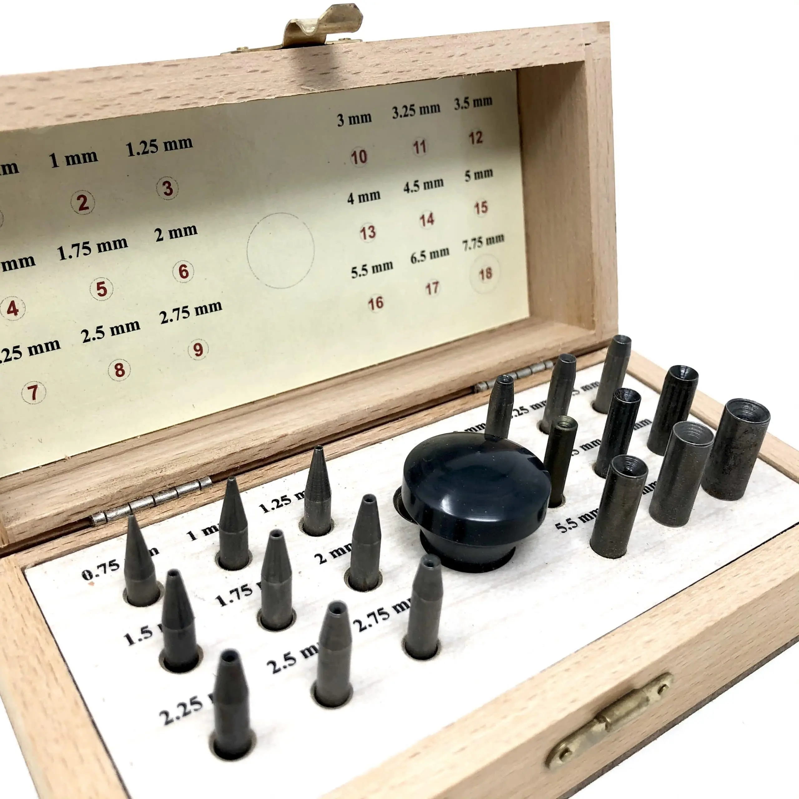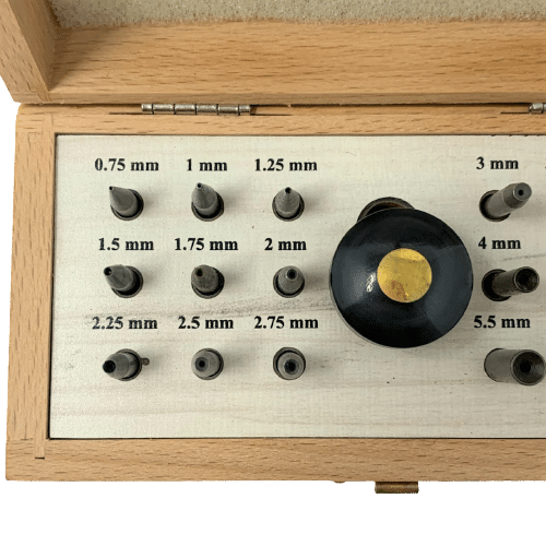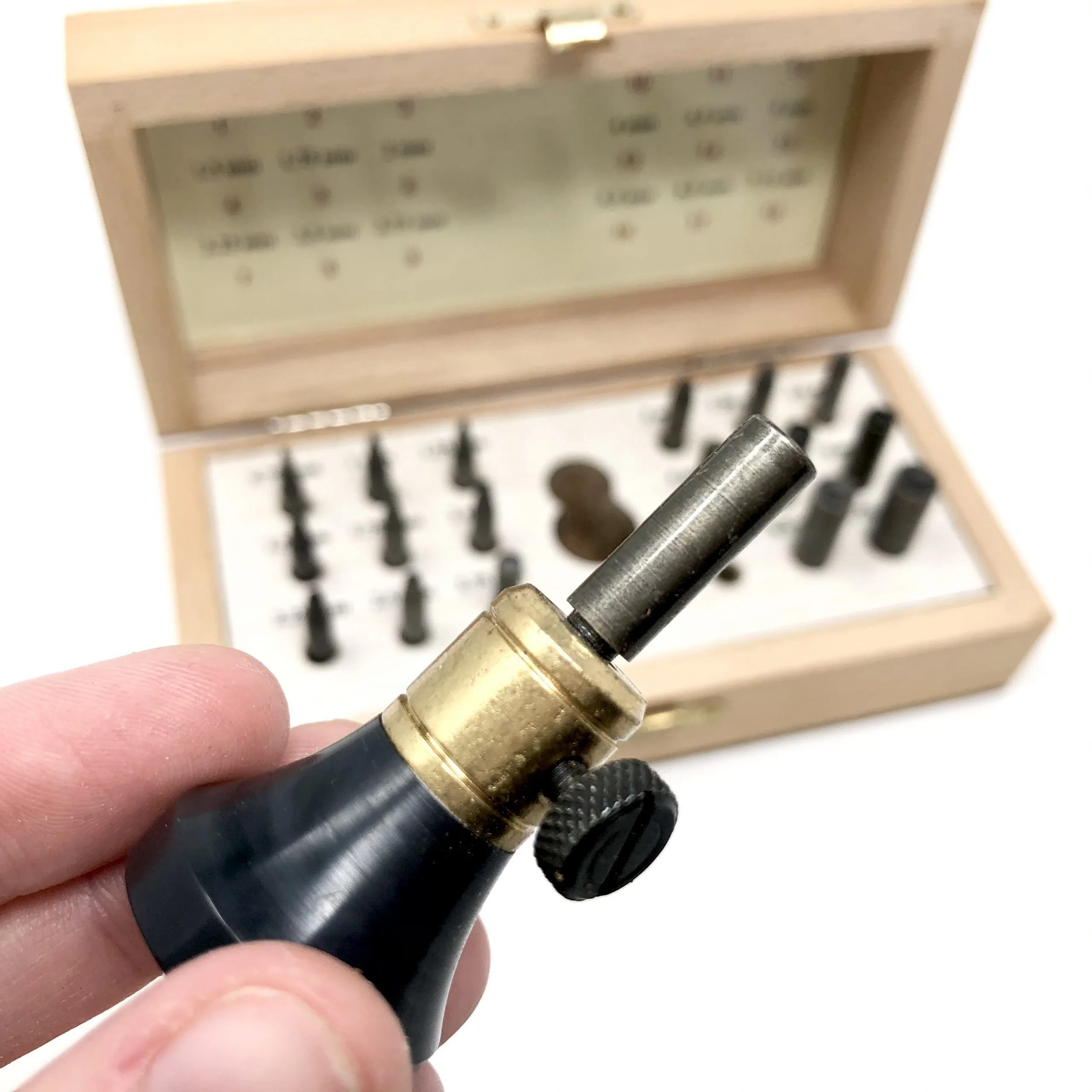 - A set of 18 round bezel setting punches in a wooden storage box with handle