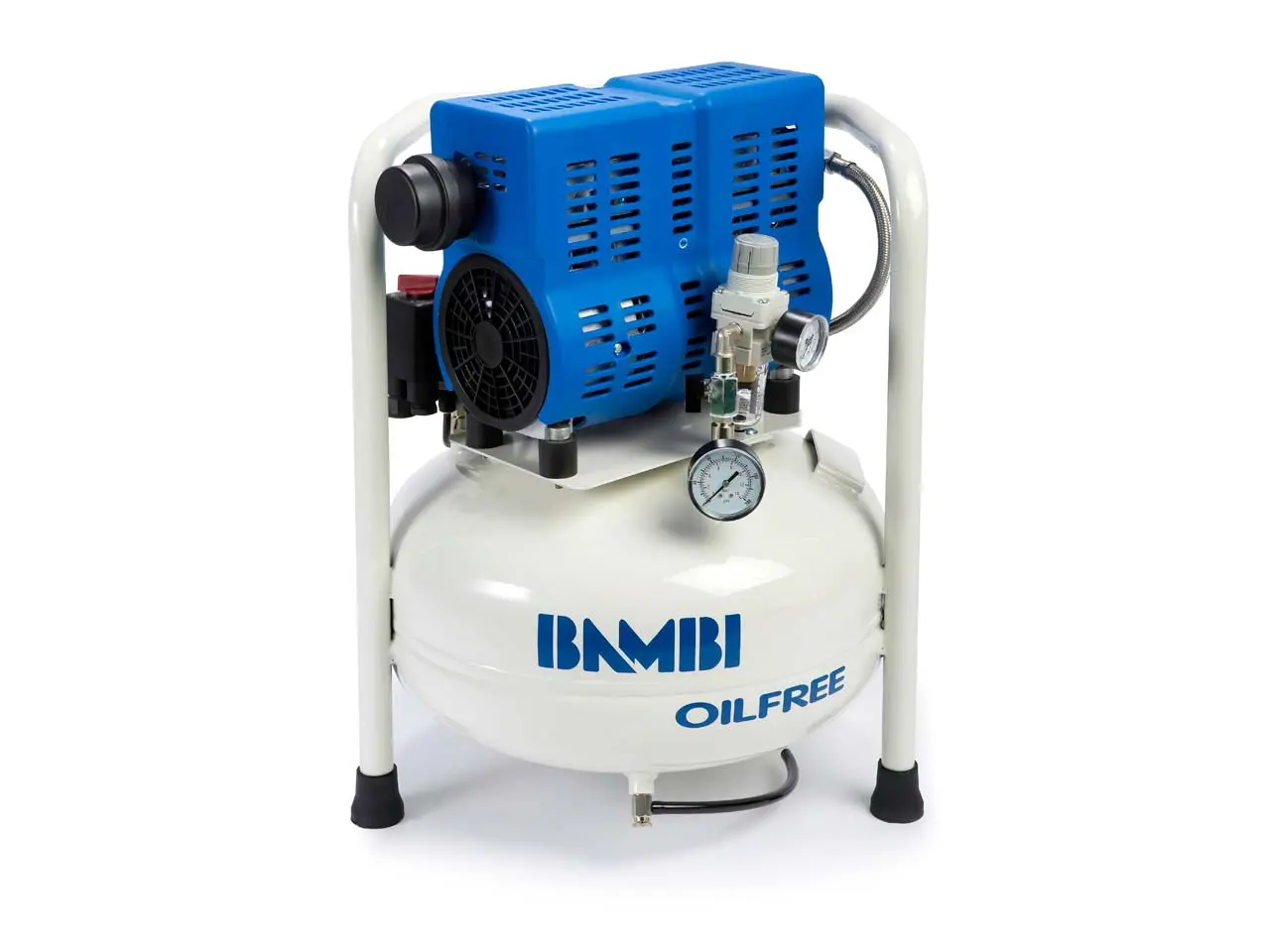 A quality, reliable, oil-free air compressor from Bambi. With ultra low noise and 100% oil free operation, the PT24 delivers a low maintenance solution to ultra-quiet oil free compressed air. PT24 runs off a single phase 240v supply and come with a standard 3 pin plug for the UK.