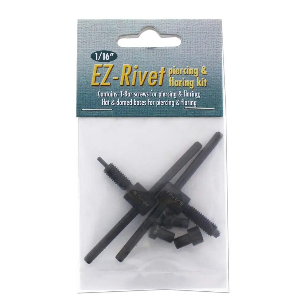 The Beadsmith EZ-Rivet Piercing and Flaring Kit contains T-Bar Screws and flat and domed bases for piercing and flaring flat metal sheet or curved items. Measures 1/16″ diameter. For use with the EZ-Rivet Tool