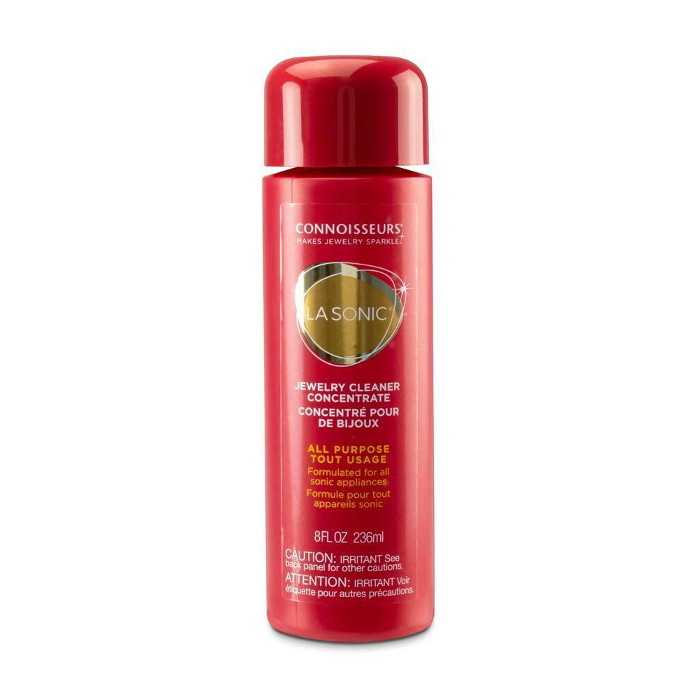Connoisseurs All-Purpose Jewelry Cleaner Concentrate is formulated for use in the LaSonic® SafeWave® twin-tank and the LaSonic Jewelry Bath, our ultimate at-home professional jewelry cleaning systems. This concentrated formula is ammonia free and safe for all types of jewelry, from precious stones to costume jewelry. Each 8-oz. bottle makes one-half gallon of deep cleaning solution when diluted. Store concentrate on your bathroom vanity, near your LaSonic cleaning system, for sparkle-ready jewelry any time!