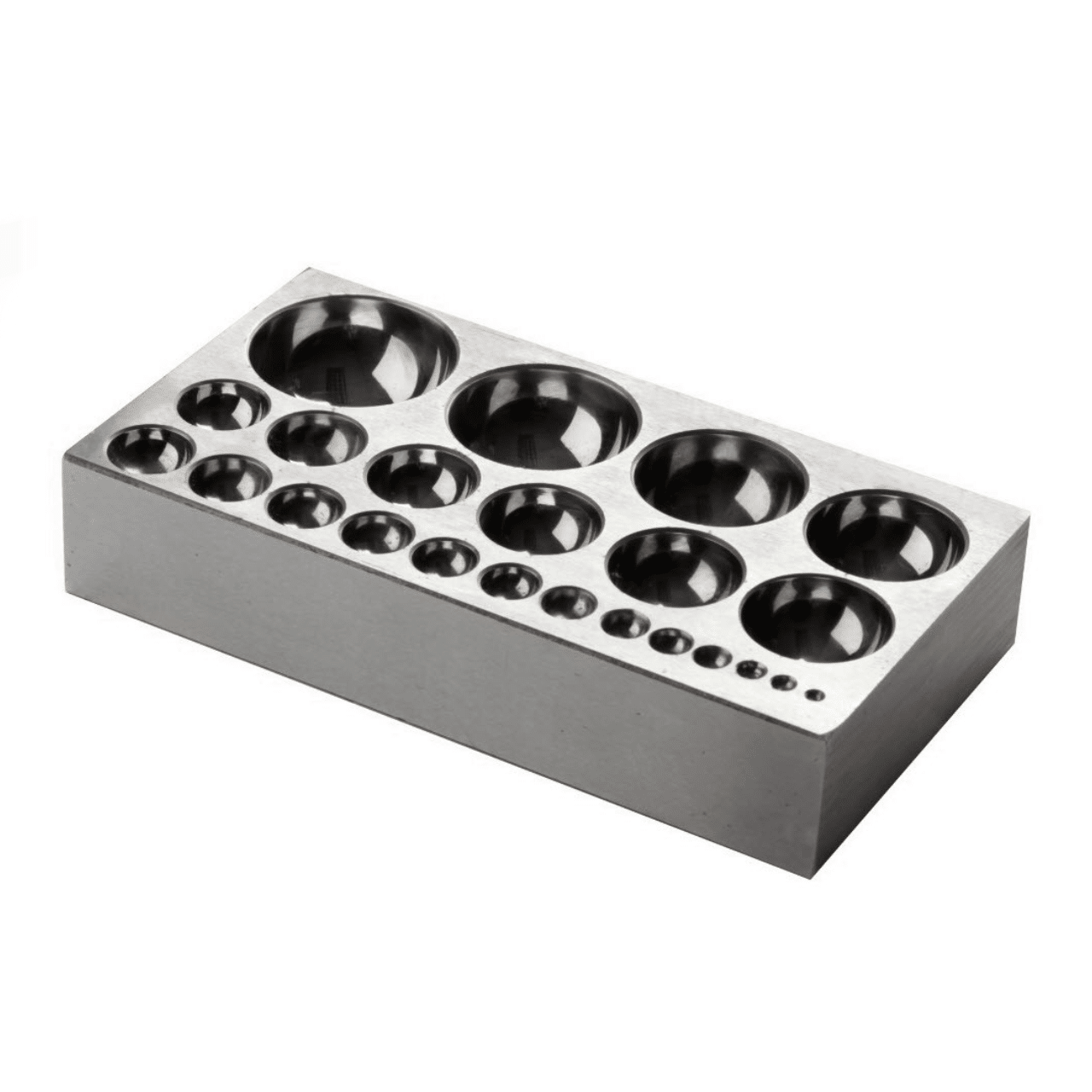The 23 Hole Flat Dapping Block from Durston Tools is a great tool for any busy jewellery workshop. It features 23 half spheres within the dapping block, ranging from 3mm up to 38mm ((3, 4, 5, 6, 7, 8, 9, 10, 11, 12, 13, 14, 15, 16, 17, 19, 21, 23, 25, 27, 30, 34, 38mm). The dapping block weighs in at 2.3 kilos and measures 150mm by 80mm and is 30mm high.
