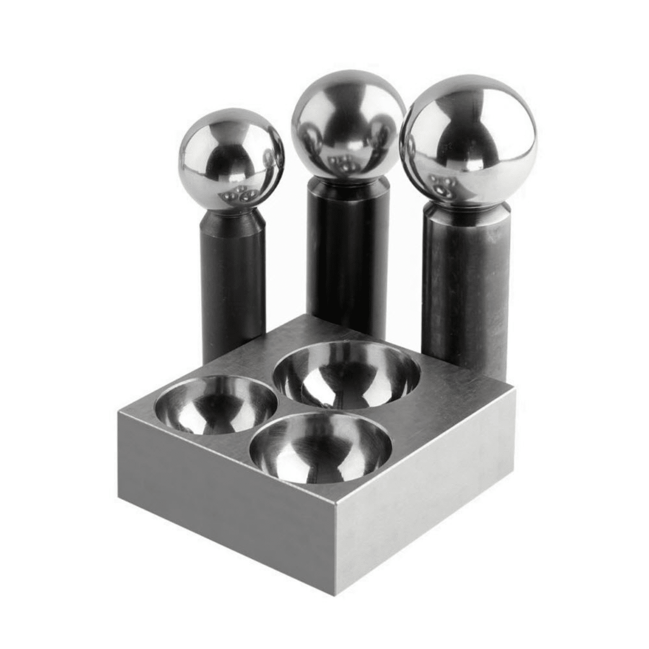 The 23 Hole Flat Dapping Block from Durston has three half-spheres of 42, 47 and 52mm. The set also includes three punches in 40, 45 and 50mm sizes. The block is 100mm by 100mm, and it is 34mm high and weighs in at 4.6 kilos with the punches.