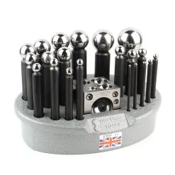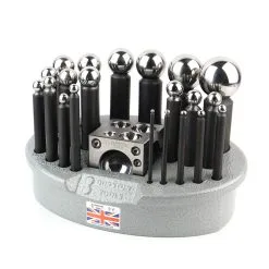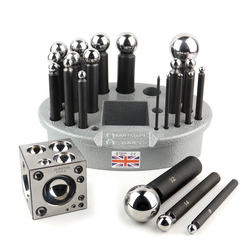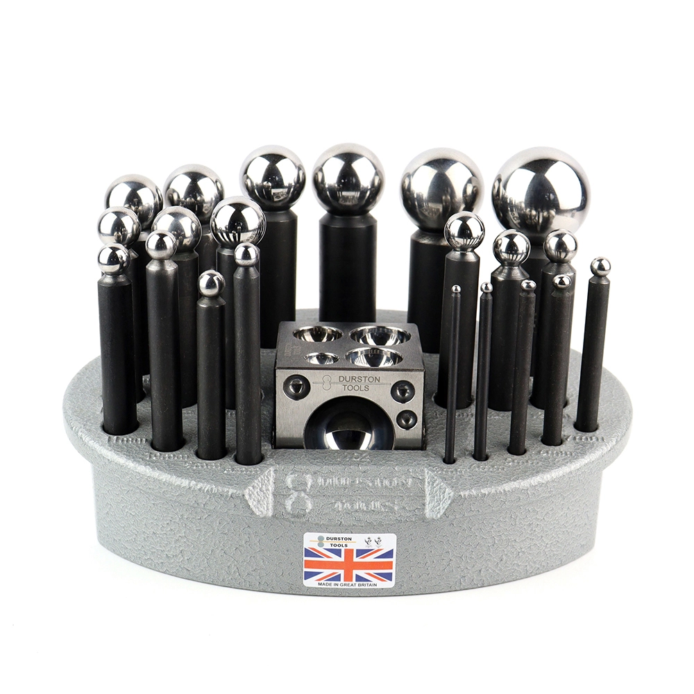 All set pieces fit perfectly into Durston’s unique carrying tray. The half spheres are finished like no other; hardened, ground and polished to perfection. Punches sizes (mm) are 3, 4, 5, 6, 7, 8, 10, 11, 12, 13, 14, 15, 17, 19, 21, 23, 25, 28, 32 and 36.