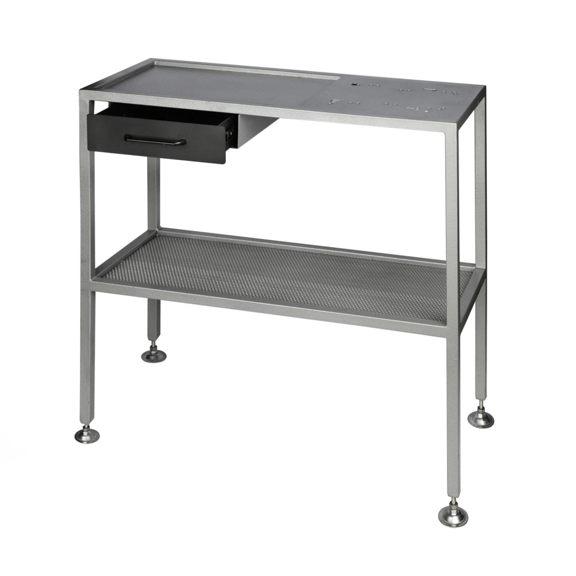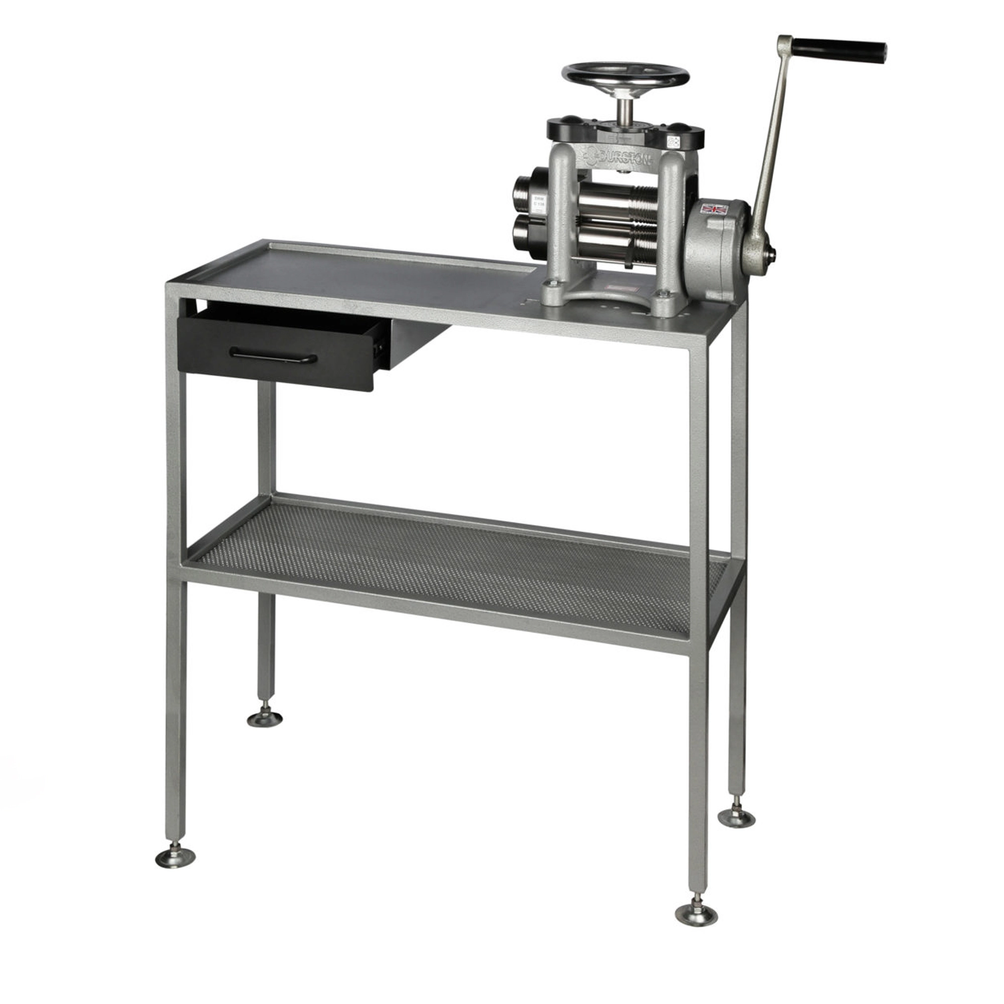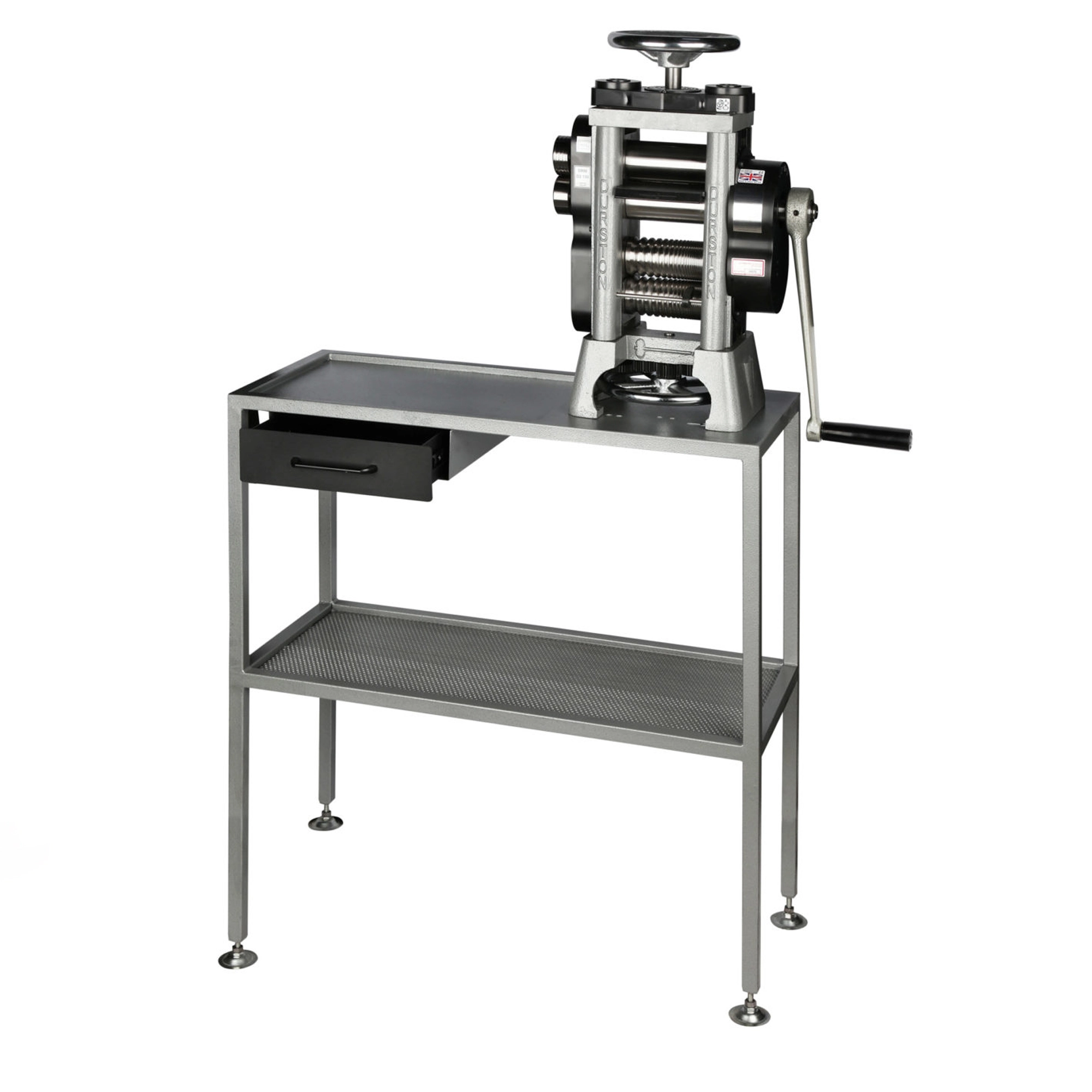 Durston’s new workstation stand has been created and specially designed to meet your workspace needs. Pre-drilled holes make attaching your rolling mill easier than ever before. Along with a dropped work area, a shelf and drawer also provide you with essential storage space. It has been created to be used with our Manual Rolling Mills.