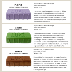 Low temperature low speed compound for Bristle brush wheels Designed for use on bristle brush wheels mounted on power tools. Working a low speeds, to polish intricate surfaces after 400-600 grit sandpaper. For use with all jewellery alloys for surface scratch removal.