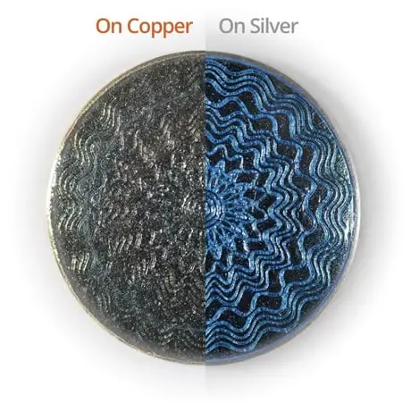 Our range of transparent Jewellery enamels are designed for use on tombac (gilding metal), copper, gold and silver. The guilloche pattern is a reproduction of a type of metal engraving that was popular at the turn of the 20th Century.